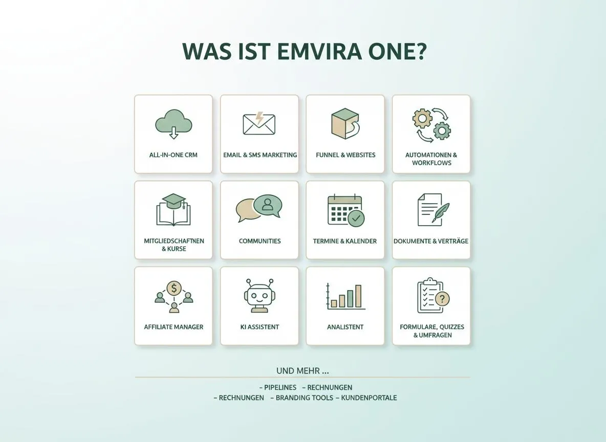 Mit EMVIRA ONE fließt alles an einem Ort zusammen: CRM, Funnels, E-Mail-Marketing, Automationen, Community und mehr.